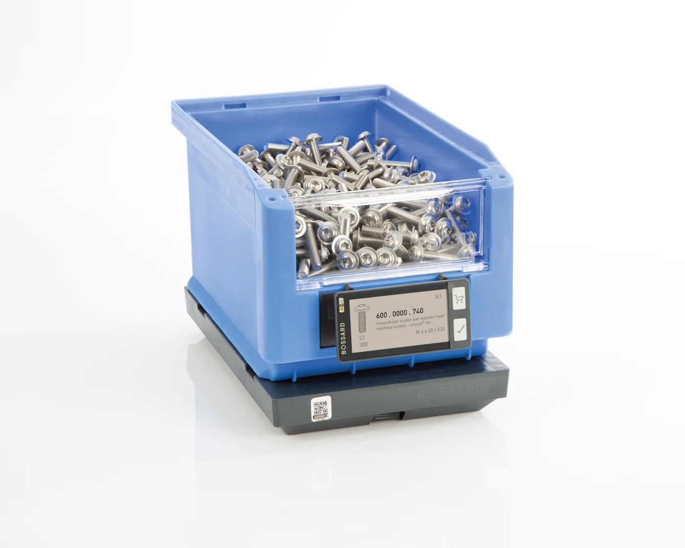 Although our label can function independently on your existing storage systems, it becomes even more powerful when paired with Bossard’s SmartBin. The label displays provide real-time information and instant ordering, while our bins' automatic weight-based sensors ensure replenishment is triggered with no operator action required.